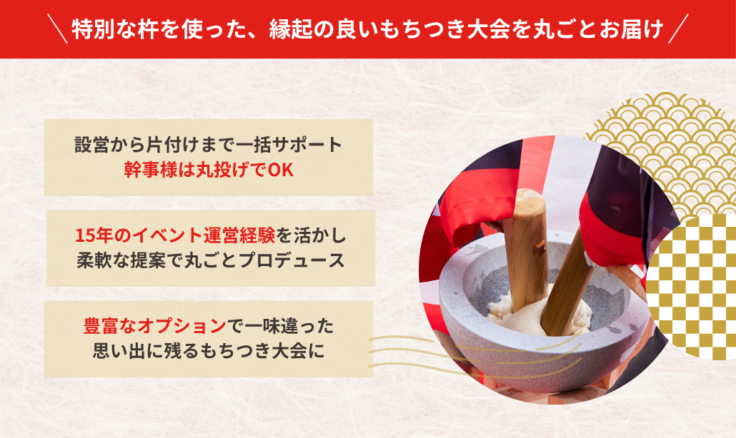 15年以上のイベント開催経験を活かし、もちつき大会を盛り上げるのにお勧めのオプションを多数取り揃えております。ご依頼いただければ、いつもとは違う思い出に残るもちつき大会になること間違いなし。