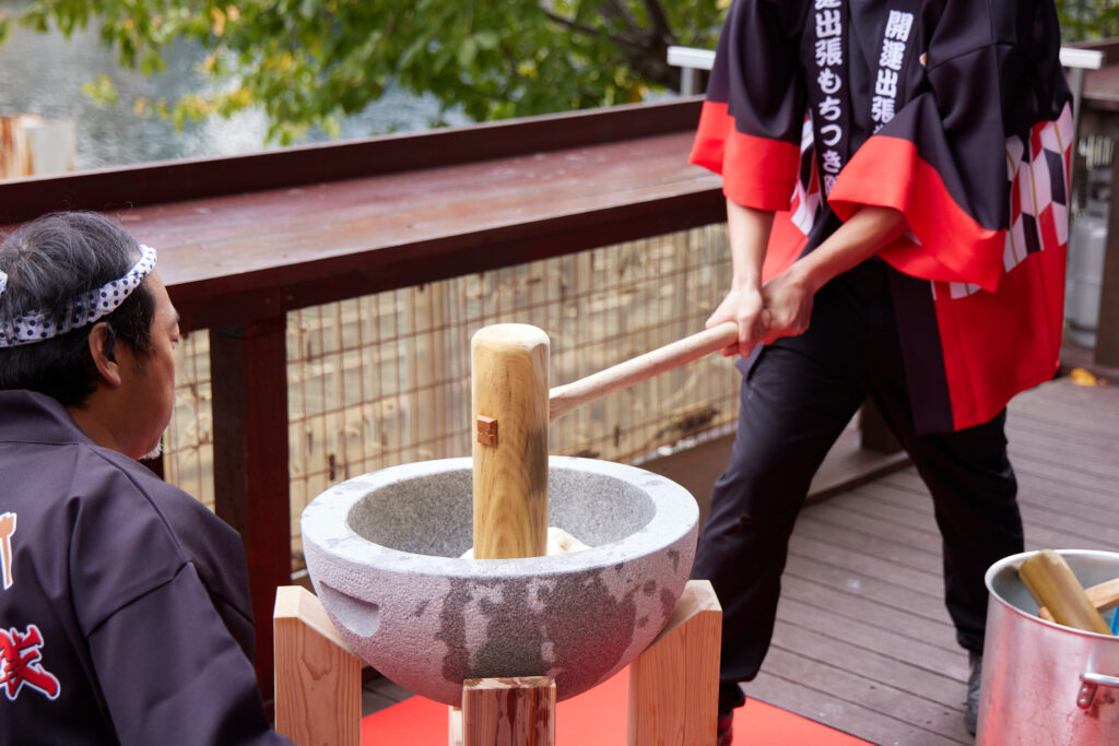 - ご祈祷を受けた縁起の良い杵を使った、本格的な杵つきパフォーマンスや盛り上げ演出