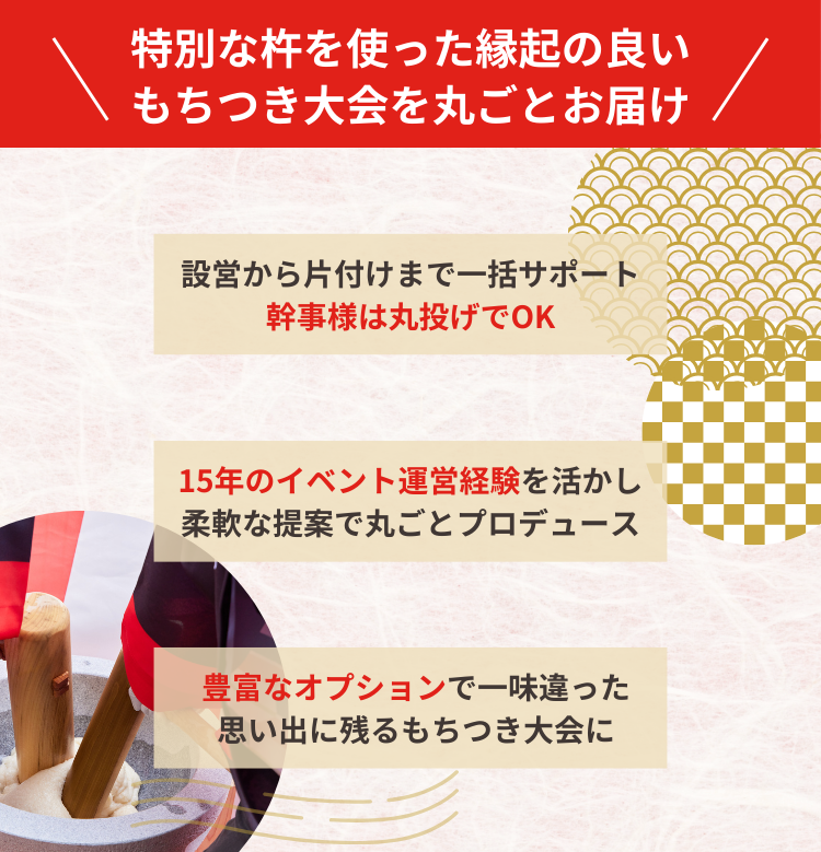 15年以上のイベント開催経験を活かし、もちつき大会を盛り上げるのにお勧めのオプションを多数取り揃えております。ご依頼いただければ、いつもとは違う思い出に残るもちつき大会になること間違いなし。